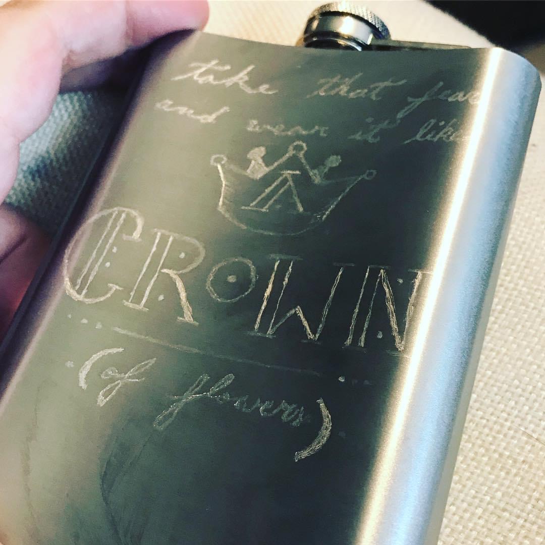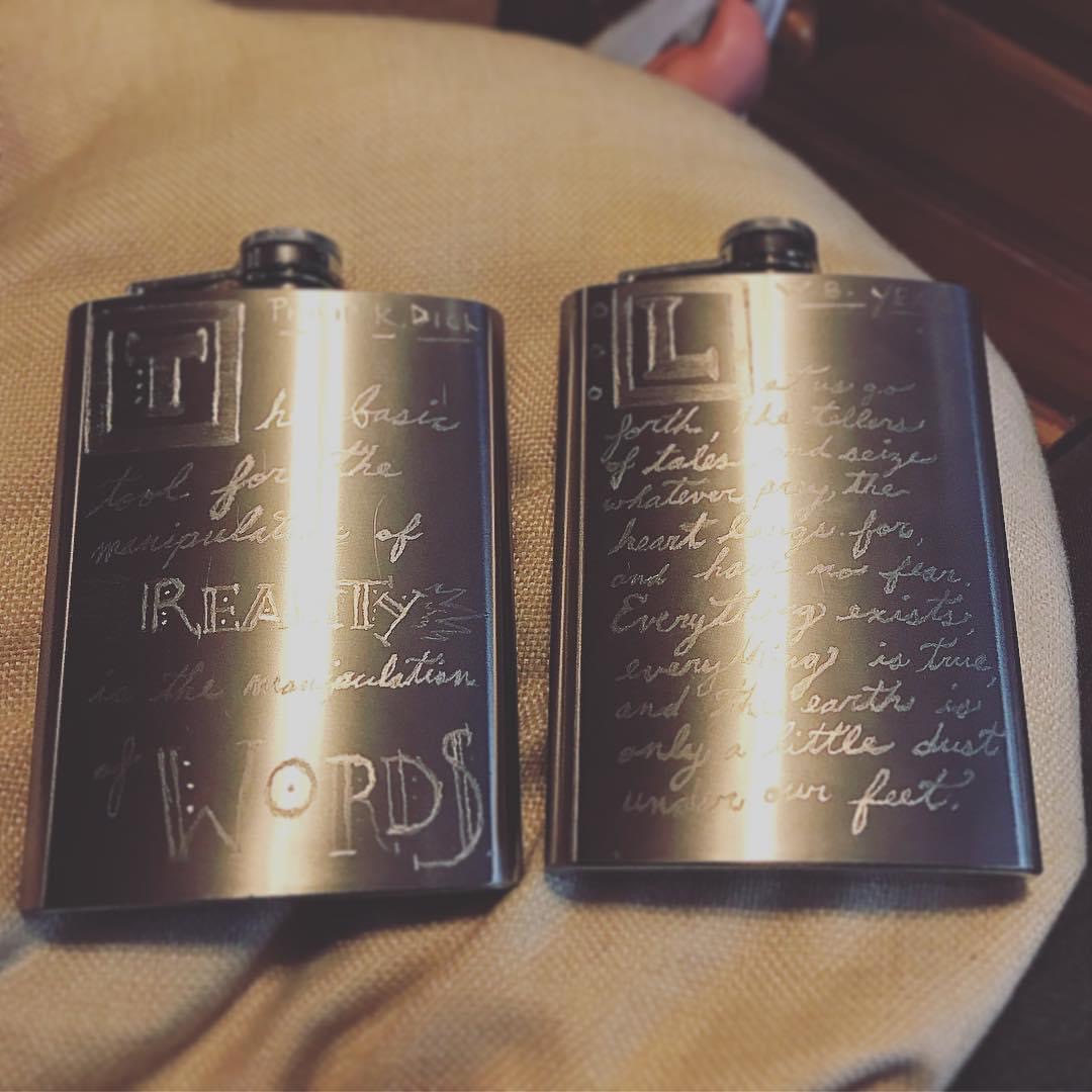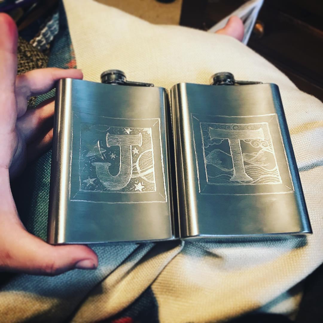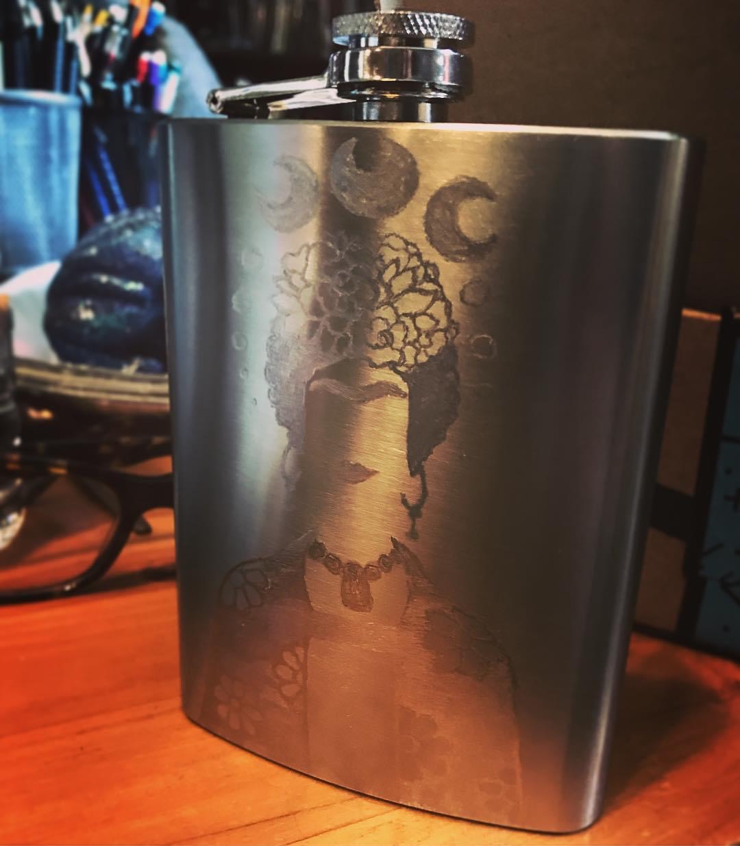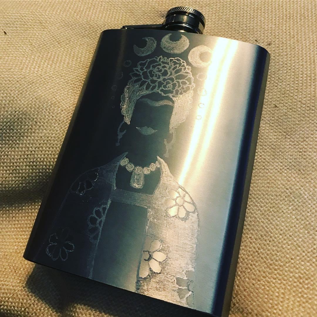 Created as graduation presents for my friends at grad school, these flasks are done by hand with an etching pen. Mine depicts Frida Kahlo’s silhouette with a line from a Rebekka Karijord song on the back. My friend J’s has a window into outer space on one side and a quote from Philip K. Dick on the other; T’s has a window to a rolling Celtic landscape on one side with a W.B. Yeats quote on the other.