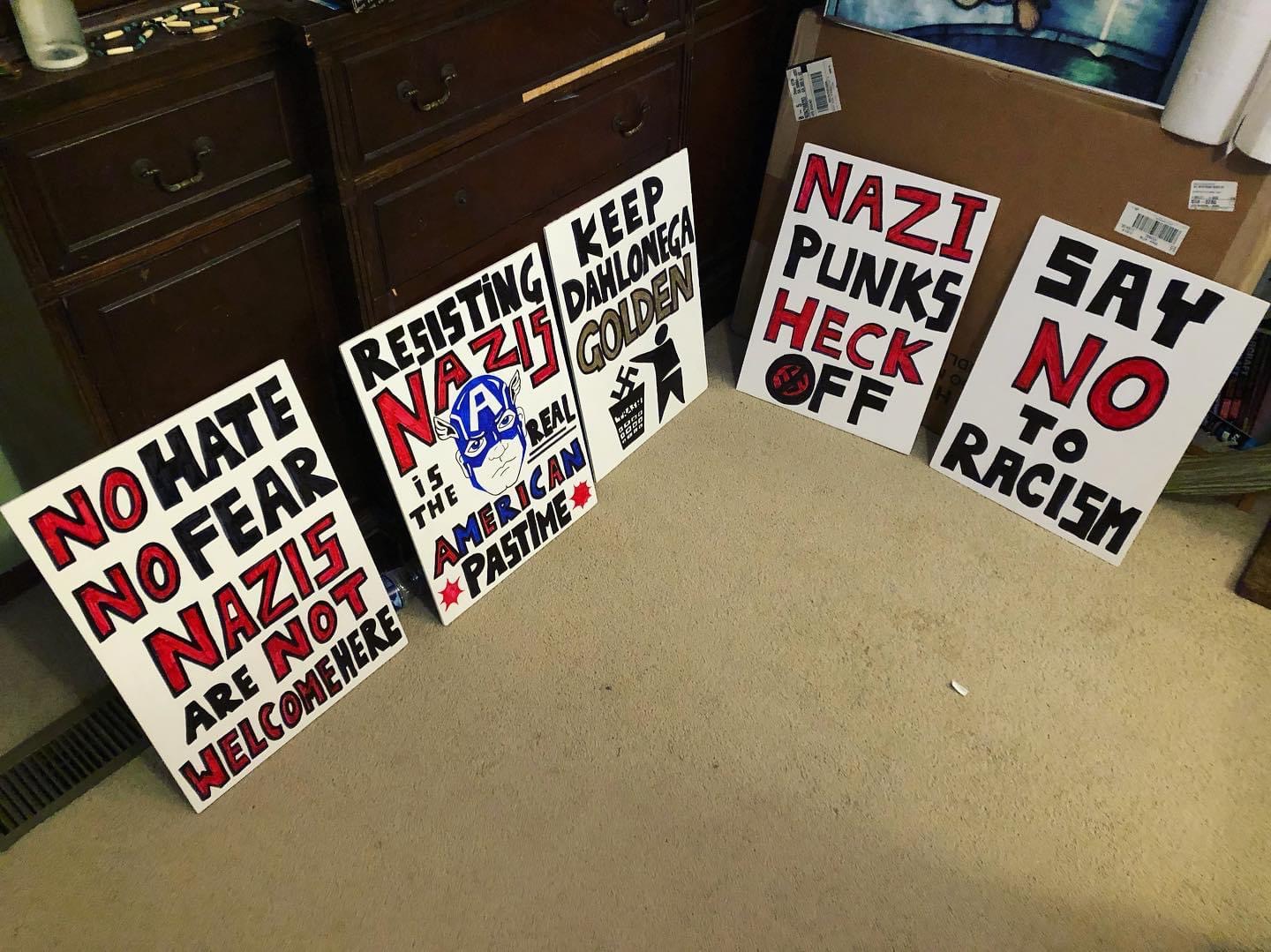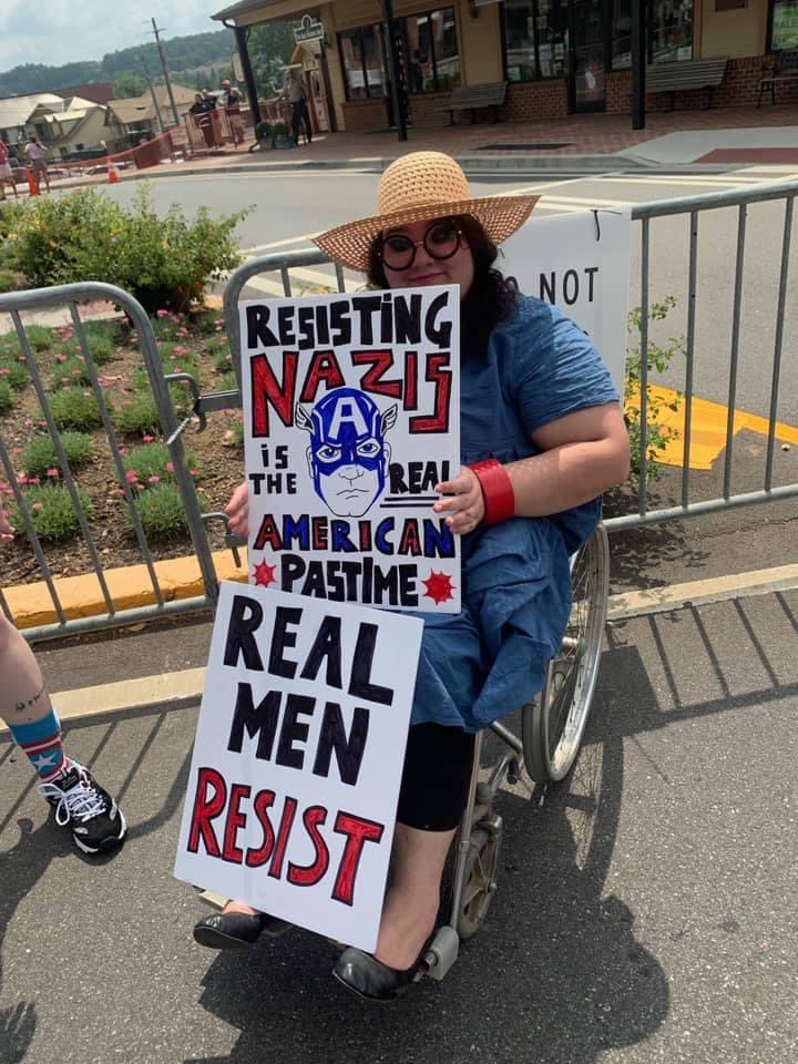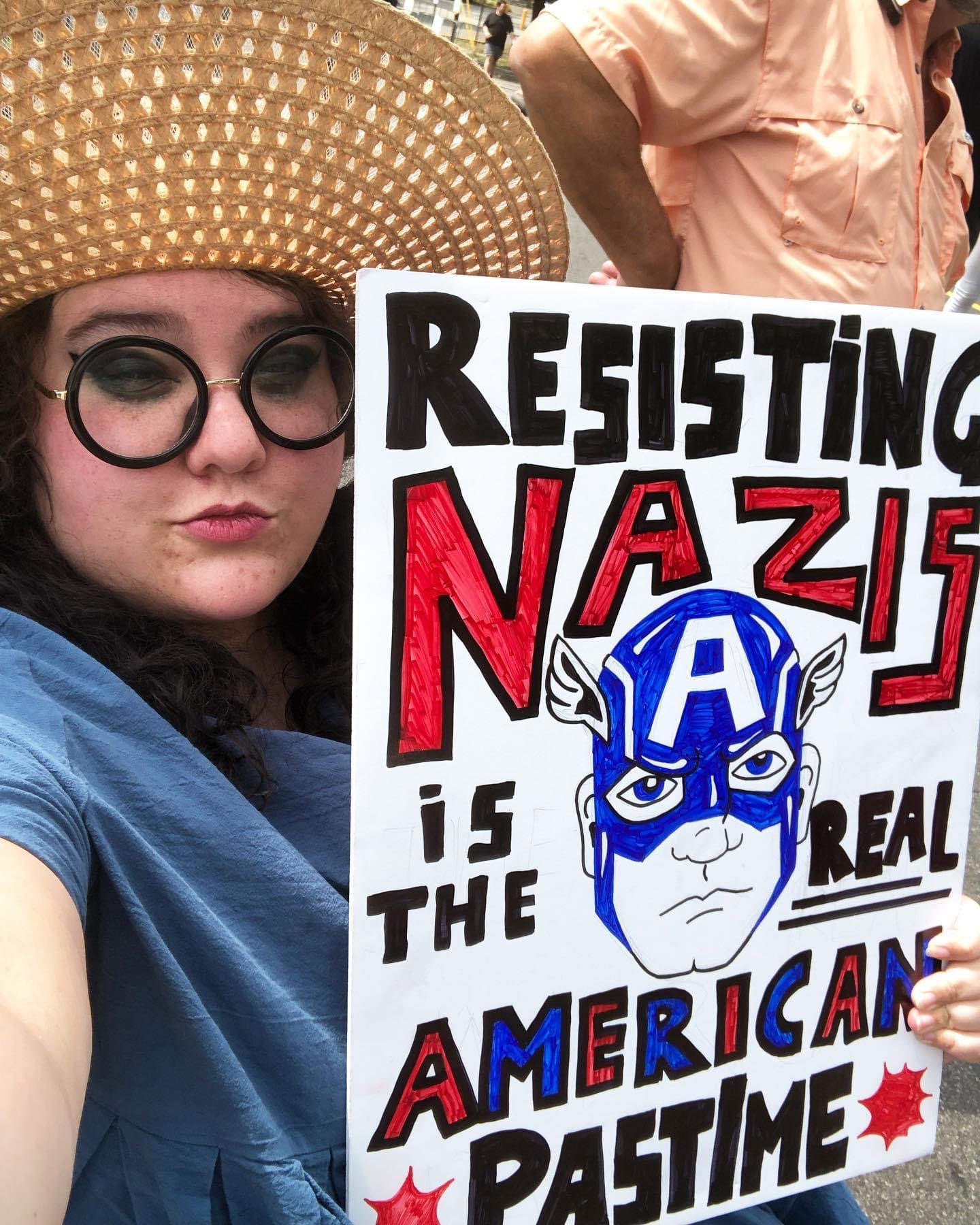 While I did have to take my immunocompromised self off the streets when the pandemic hit, I was out all the way up til then, waving Steve Rogers’ face at neo-Nazi scum from a wheelchair. (Really should’ve made one that said, “We won’t STAND for this anymore,” given the whole wheelchair thing, but in my defense, I’d just gotten minor brain damage and wasn’t thinking super well.)